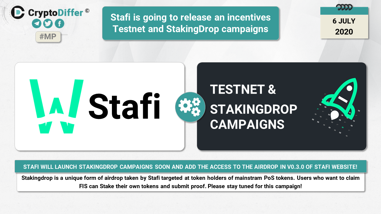 Stakingdrop is a unique form of airdrop taken by Stafi targeted at token holders of mainstram PoS tokens. Users who want to claim FIS can Stake their own tokens and submit proof. Please stay tuned for this campaign!