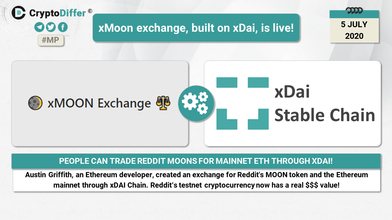 Austin Griffith, an Ethereum developer, created an exchange for Reddit's MOON token and the Ethereum mainnet through xDAI Chain. Redditβs testnet cryptocurrency now has a real $$$ value! People can trade Reddit MOONs for mainnet ETH through xDai!