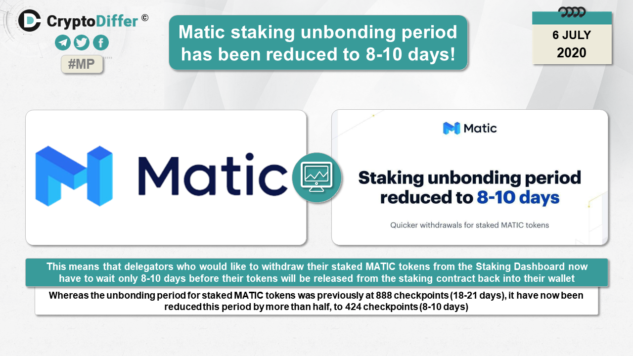 Whereas the unbonding period for staked MATIC tokens was previously at 888 checkpoints (18-21 days), it have now been reduced this period by more than half, to 424 checkpoints (8-10 days)