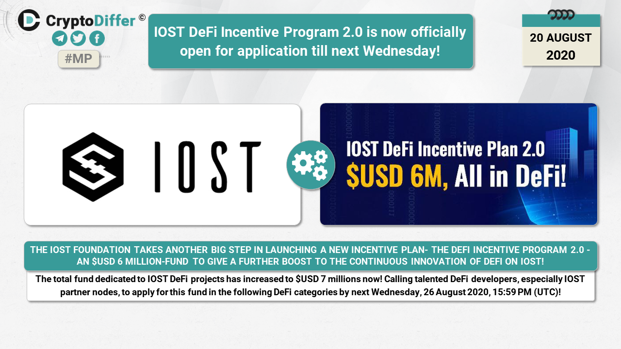 The total fund dedicated to IOST DeFi projects has increased to USD 7 millions now! Calling talented DeFi developers, especially IOST partner nodes, to apply for this fund in the following DeFi categories by next Wednesday, 26 August 2020, 15:59 PM (UTC)!