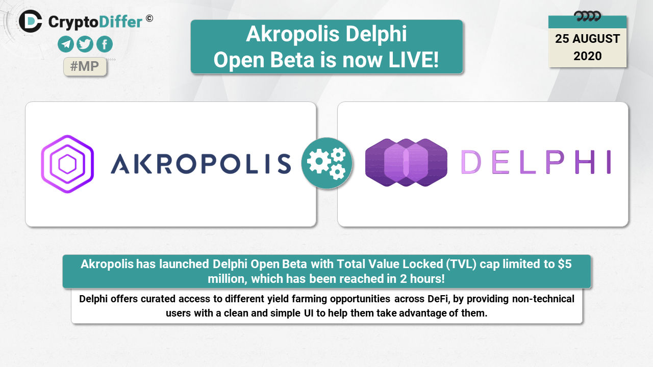 Akropolis has launched Delphi Open Beta with Total Value Locked (TVL) cap limited to $5 million, which has been reached in 2 hours! Delphi offers curated access to different yield farming opportunities across DeFi, by providing non-technical users with a clean and simple UI to help them take advantage of them.