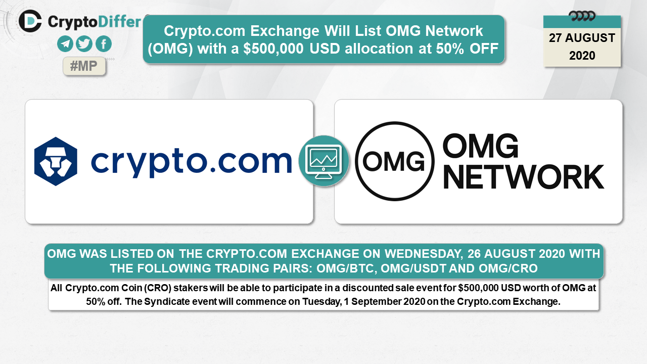 OMG was listed on the Crypto.com Exchange on Wednesday, 26 August 2020 with the following trading pairs: OMG/BTC, OMG/USDT and OMG/CRO. All Crypto.com Coin (CRO) stakers will be able to participate in a discounted sale event for $500,000 USD worth of OMG at 50% off. The Syndicate event will commence on Tuesday, 1 September 2020 on the Crypto.com Exchange.