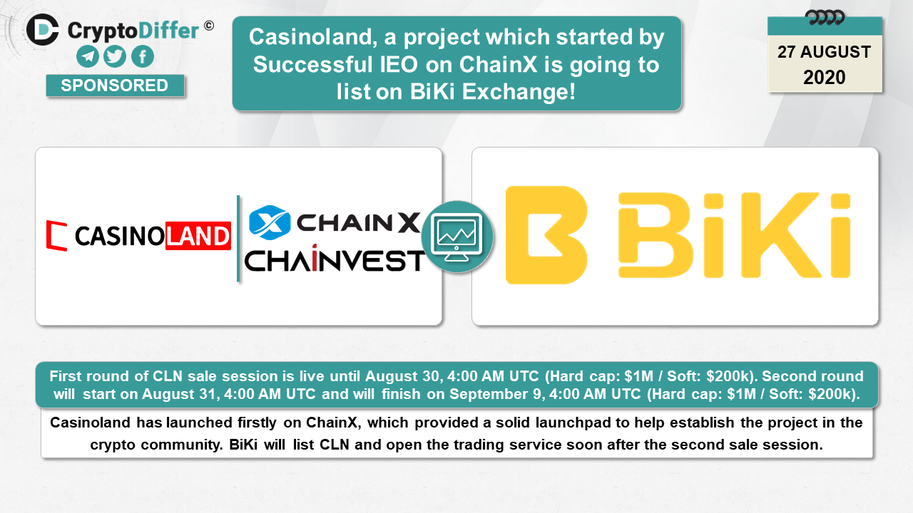 First round of CLN sale session is live until August 30, 4:00 AM UTC (Hard cap: $1M / Soft: $200k). Second round will start on August 31, 4:00 AM UTC and will finish on September 9, 4:00 AM UTC (Hard cap: $1M / Soft: $200k). Casinoland has launched firstly on ChainX, which provided a solid launchpad to help establish the project in the crypto community. BiKi will list CLN and open the trading service soon after the second sale session.