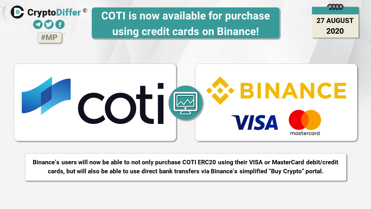 Binanceβs users will now be able to not only purchase COTI ERC20 using their VISA or MasterCard debit/credit cards, but will also be able to use direct bank transfers via Binanceβs simplified βBuy Cryptoβ portal.