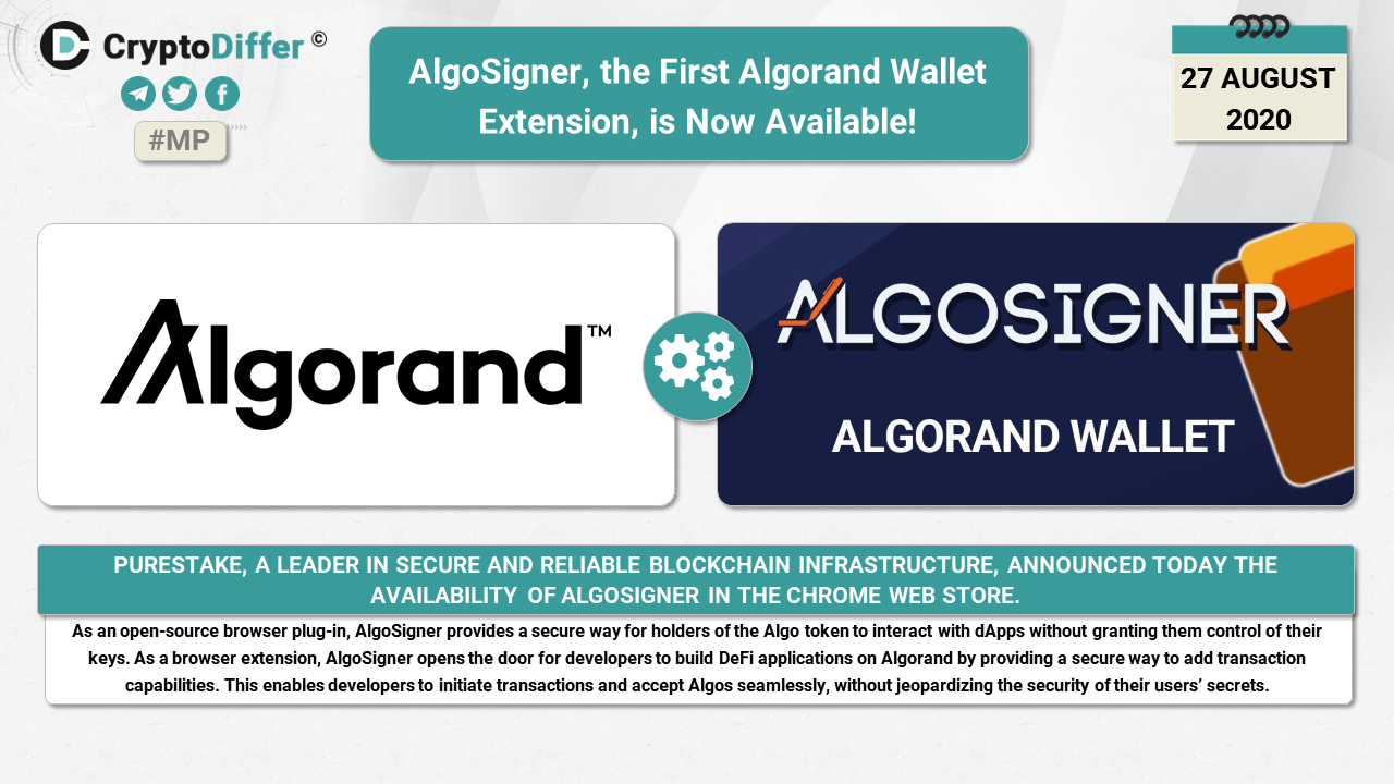 PureStake, a leader in secure and reliable blockchain infrastructure, announced today the availability of AlgoSigner in the Chrome Web Store. As an open-source browser plug-in, AlgoSigner provides a secure way for holders of the Algo token to interact with dApps without granting them control of their keys.
