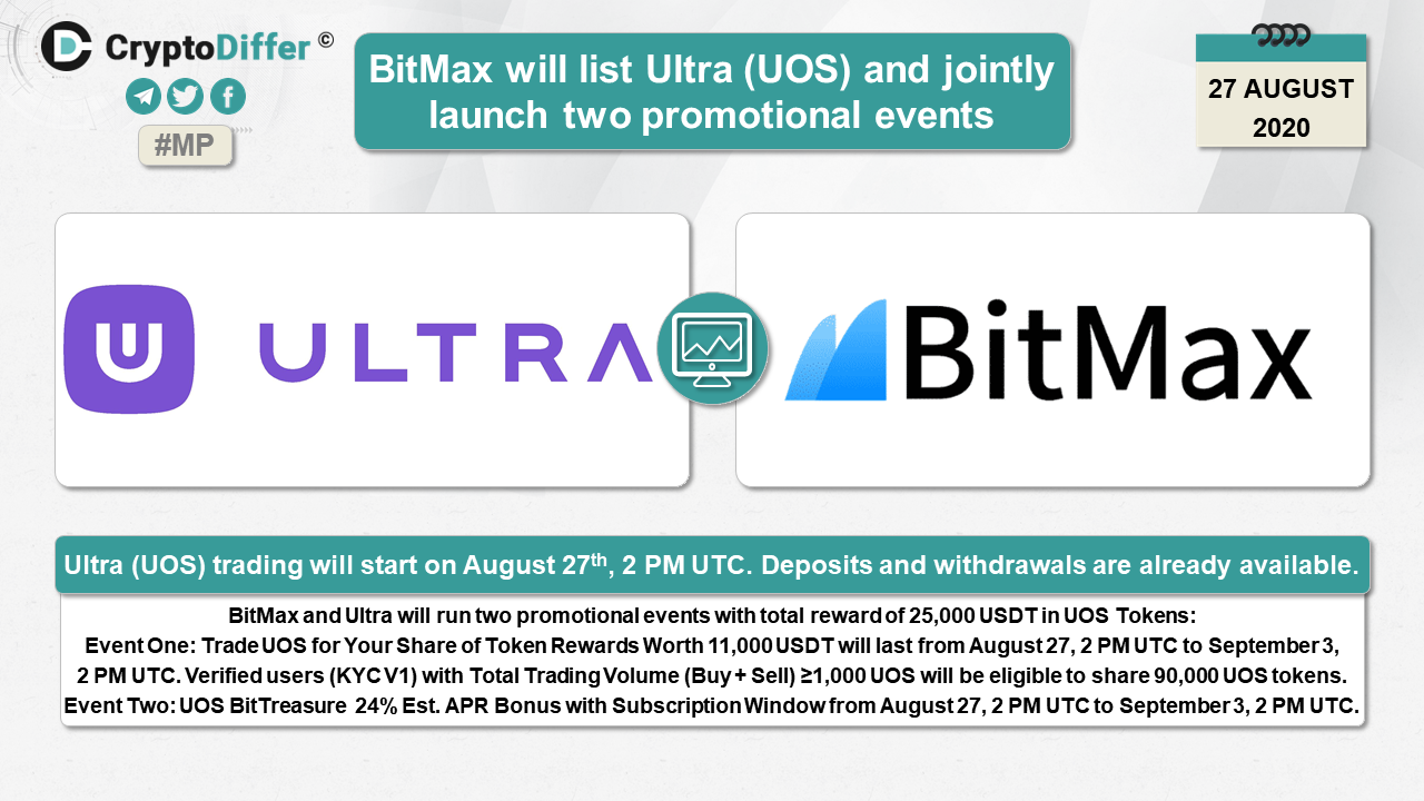 Trading, Deposits and withdrawals are already available. BitMax and Ultra will run two promotional events with total reward of 25,000 USDT in UOS Tokens: