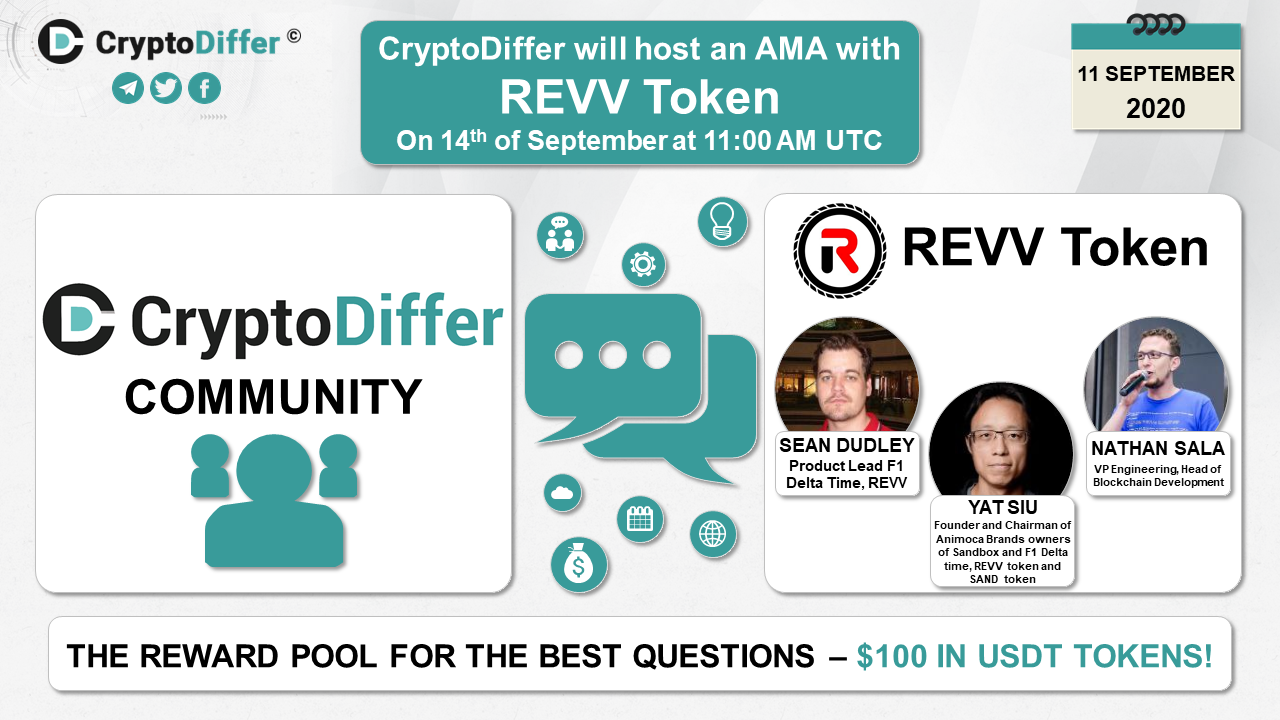 โโโ๏ธDear community, CryptoDiffer will hold an AMA with REVV Token on the 14th of September at 11:00 AM UTC in the CryptoDiffer Telegram Chat!