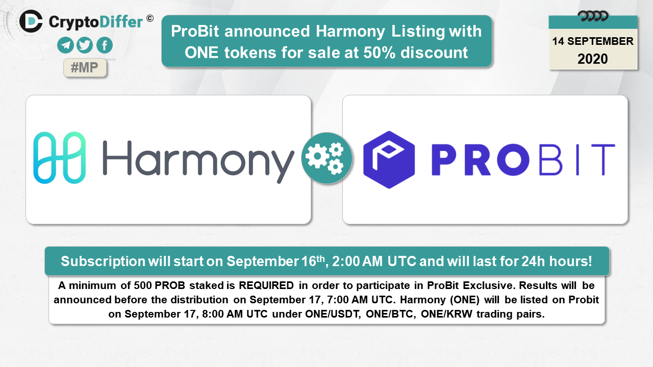 Subscription will start on September 16th, 2:00 AM UTC and will last for 24h hours! A minimum of 500 PROB staked is REQUIRED in order to participate in ProBit Exclusive. Results will be announced before the distribution on September 17, 7:00 AM UTC. Harmony (ONE) will be listed on Probit on September 17, 8:00 AM UTC under ONE/USDT, ONE/BTC, ONE/KRW trading pairs.