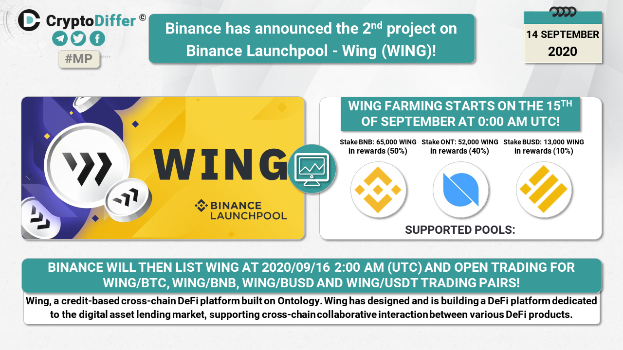 Binance will then list WING at 2020/09/16 2:00 AM (UTC) and open trading for WING/BTC, WING/BNB, WING/BUSD and WING/USDT trading pairs.