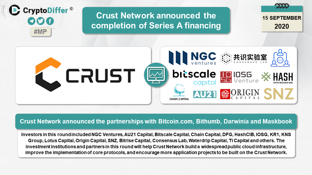 Crust Network announced the partnerships with Bitcoin.com, Bithumb, Darwinia and Maskbook. Investors in this round included NGC Ventures, AU21 Capital, Bitscale Capital, Chain Capital, DFG, HashCIB, IOSG, KR1, KNS Group, Lotus Capital, Origin Capital, SNZ, Bitrise Capital, Consensus Lab, Waterdrip Capital, Ti Capital and others. The investment institutions and partners in this round will help Crust Network build a widespread public cloud infrastructure, improve the implementation of core protocols, and encourage more application projects to be built on the Crust Network.