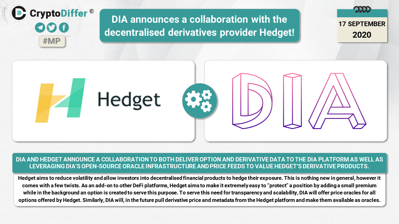 ββDIA and Hedget announce a collaboration to both deliver option and derivative data to the DIA platform as well as leveraging DIAβs open-source oracle infrastructure and price feeds to value Hedgetβs derivative products.
