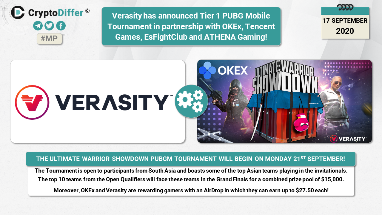 ββVerasity has announced Tier 1 PUBG Mobile Tournament in partnership with OKEx, Tencent Games, EsFightClub and ATHENA Gaming!