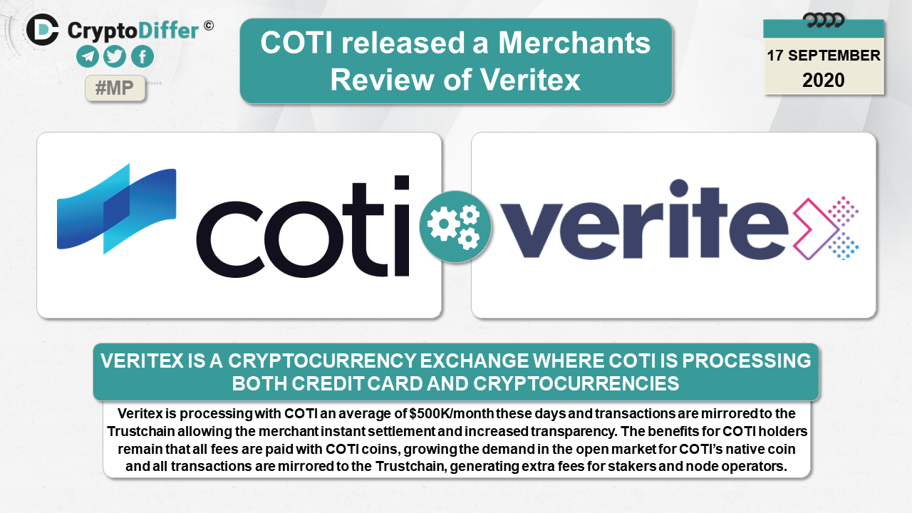 Veritex is a cryptocurrency exchange where COTI is processing both Credit Card and Cryptocurrencies.
