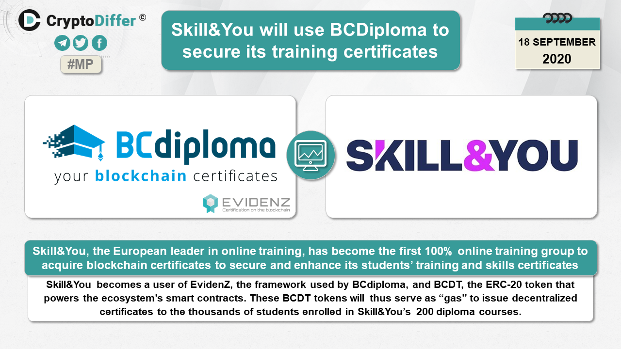 Skill&You, the European leader in online training, has become the first 100% online training group to acquire blockchain certificates to secure and enhance its students’ training and skills certificates. Skill&You becomes a user of EvidenZ, the framework used by BCВiploma, and BCDT, the ERC-20 token that powers the ecosystem’s smart contracts. These BCDT tokens will thus serve as “gas” to issue decentralized certificates to the thousands of students enrolled in Skill&You’s 200 diploma courses.