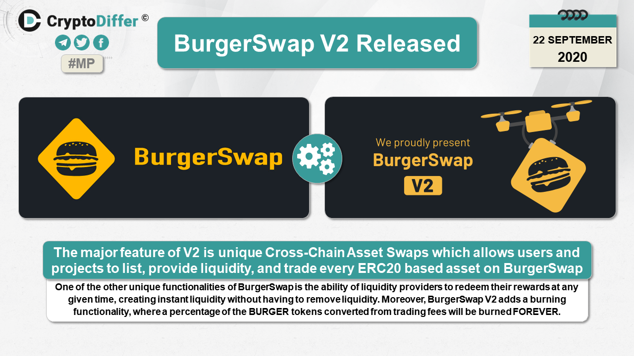 The major feature of V2 is unique Cross-Chain Asset Swaps which allows users and projects to list, provide liquidity and trade every ERC20 based asset on BurgerSwap. One of the other unique functionalities of BurgerSwap is the ability for liquidity providers to redeem their rewards at any given time, creating instant liquidity without having to remove liquidity. Moreover, BurgerSwap V2 adds a burning functionality, where a percentage of the BURGER tokens converted from trading fees will be burned FOREVER.
