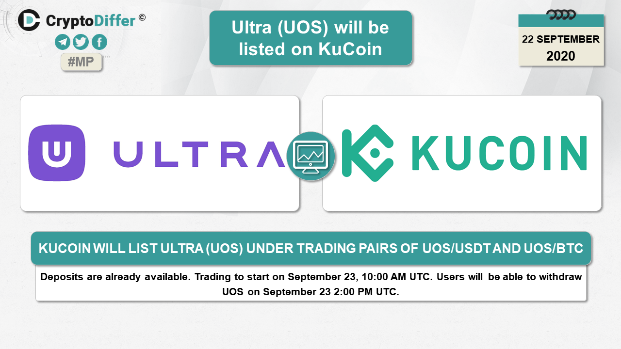 KuCoin will list Ultra (UOS) under trading pairs of UOS/USDT and UOS/BTC. Deposits are already available. Trading to start on September 23, 10:00 AM UTC. Users will be able to withdraw UOS from KuCoin on September 23 2:00 PM UTC.