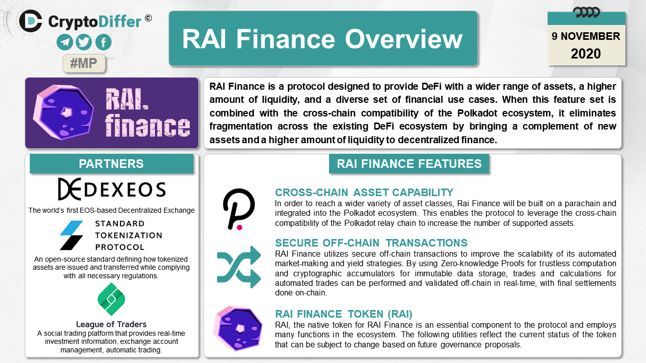 RAI Finance is a protocol designed to provide DeFi with a wider range of assets, a higher amount of liquidity, and a diverse set of financial use cases. When this feature set is combined with the cross-chain compatibility of the Polkadot ecosystem, it eliminates fragmentation across the existing DeFi ecosystem by bringing a complement of new assets and a higher amount of liquidity to decentralized finance.