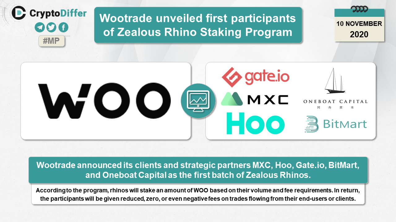 Wootrade announced its clients and strategic partners MXC, Hoo, Gate, BitMart, and Oneboat Capital as the first batch of Zealous Rhinos. According to the program, rhinos will stake an amount of WOO based on their volume and fee requirements. In return, the participants will be given reduced, zero, or even negative fees on trades flowing from their end-users or clients.