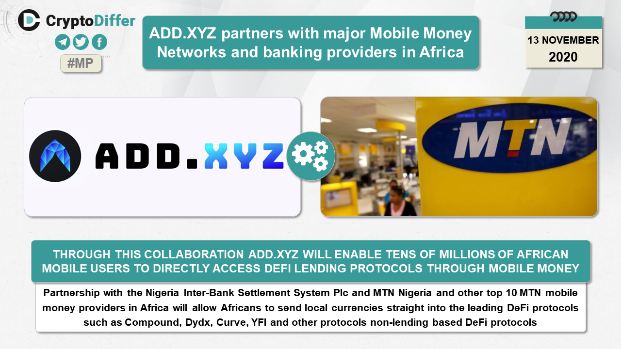 Through this collaboration ADD.xyz will enable tens of millions of African Mobile Users to directly access DeFi lending protocols through mobile money. Partnership with the Nigeria Inter-Bank Settlement System Plc and MTN Nigeria and other top 10 MTN mobile money providers in Africa will allow Africans to send local currencies straight into the leading DeFi protocols such as Compound, Dydx, Curve, YFI and other protocols non-lending based DeFi protocols