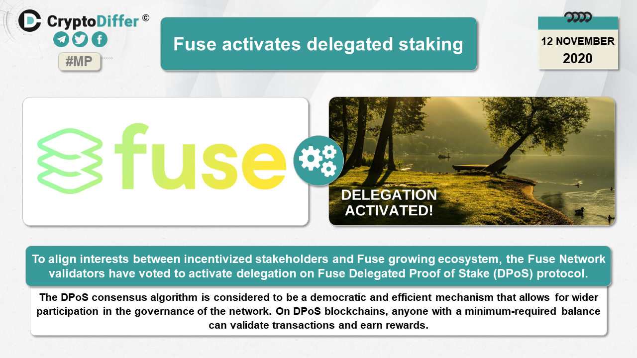 To align interests between incentivized stakeholders and Fuse growing ecosystem, the Fuse Network validators have voted to activate delegation on Fuse Delegated Proof of Stake (DPoS) protocol. The DPoS consensus algorithm is considered to be a democratic and efficient mechanism that allows for wider participation in the governance of the network. On DPoS blockchains, anyone with a minimum-required balance can validate transactions and earn rewards.