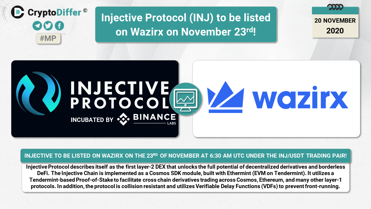 ββInjective Protocol (INJ) to be listed on Wazirx on November 23rd at 6:30 AM UTC!