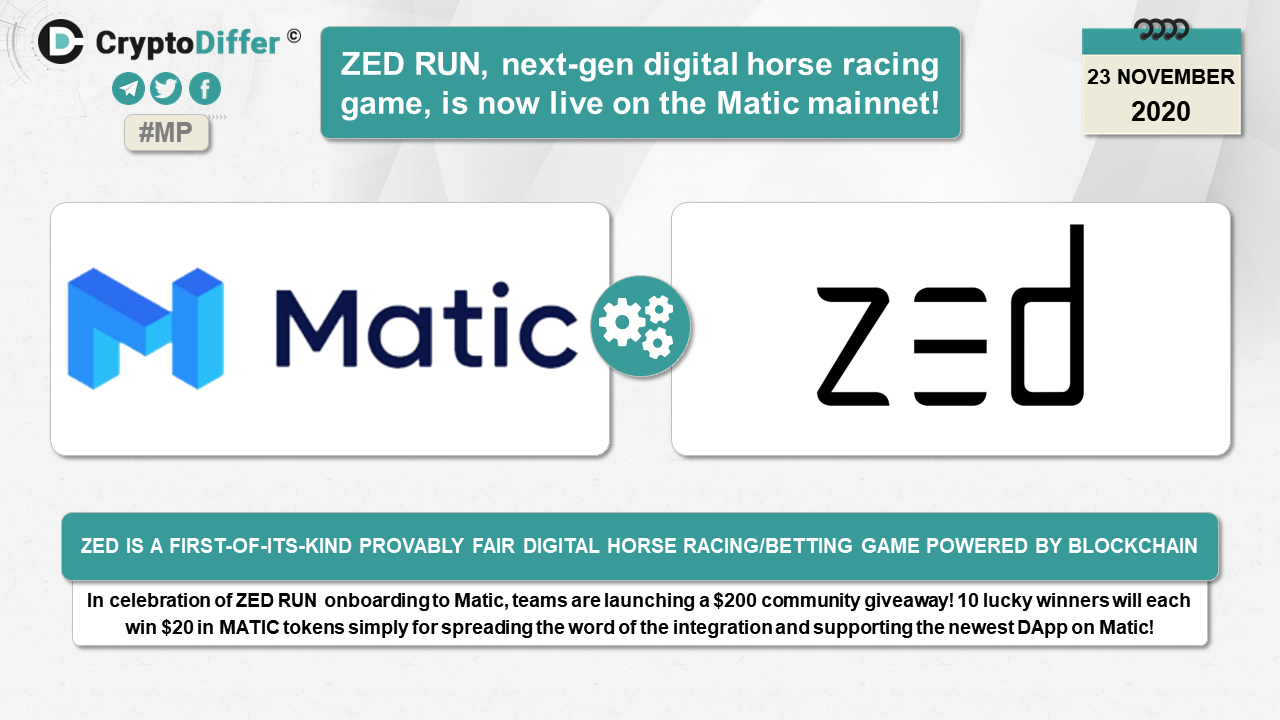 In celebration of ZED RUN onboarding to Matic, teams are launching a $200 community giveaway! 10 lucky winners will each win $20 in MATIC tokens simply for spreading the word of the integration and supporting the newest DApp on Matic!