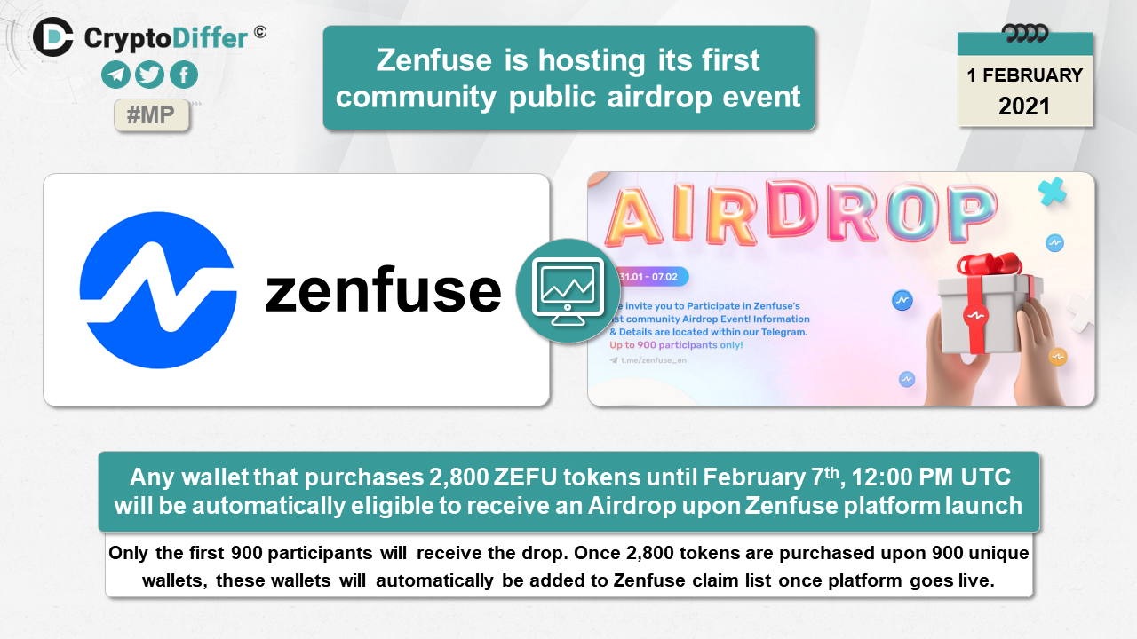 Any wallet that purchases 2,800 ZEFU tokens until February 7th, 12:00 PM UTC will be automatically eligible to receive an Airdrop upon Zenfuse platform launch. Only the first 900 participants will receive the drop.