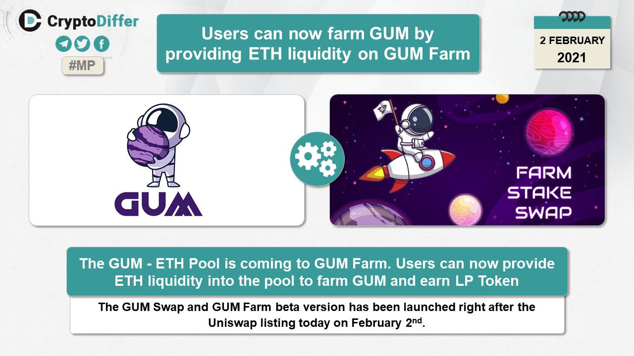 The GUM - ETH Pool is coming to GUM Farm. Users can now provide ETH liquidity into the pool to farm GUM and earn LP Token.