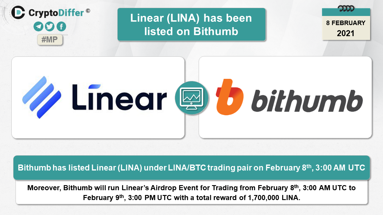 Bithumb has listed Linear (LINA) under LINA/BTC trading pair on February 8th, 3:00 AM UTC. Moreover, Bithumb will run Linearβs Airdrop Event for Trading from February 8th, 3:00 AM UTC to February 9th, 3:00 PM UTC with a total reward of 1,700,000 LINA.