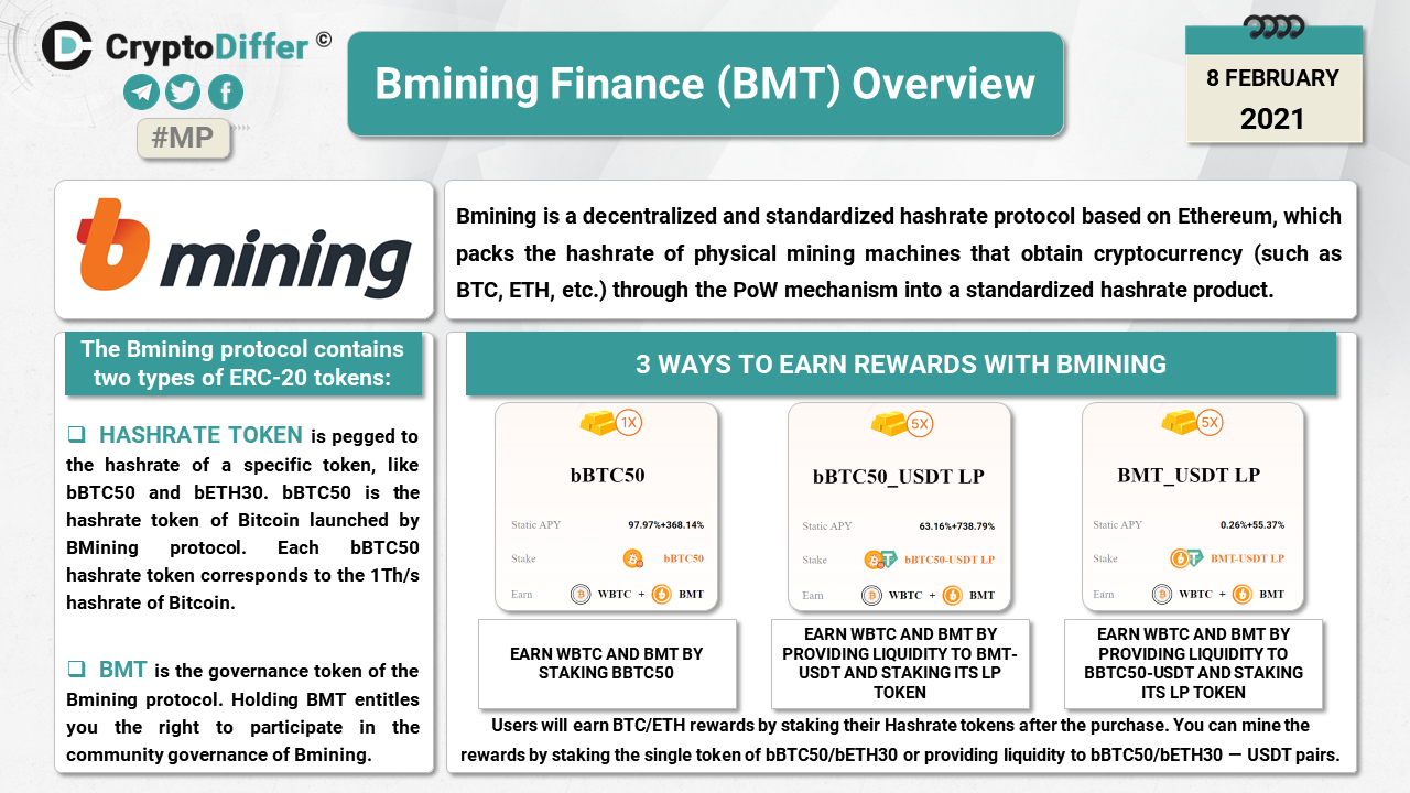 Bmining is a decentralized and standardized hashrate protocol based on Ethereum, which packs the hashrate of physical mining machines that obtain cryptocurrency (such as BTC, ETH, etc.) through the PoW mechanism into a standardized hashrate product.