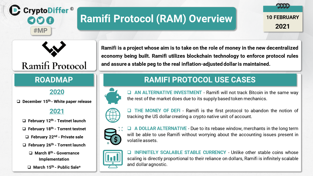 The Ramifi Protocol Public Saleβ is scheduled on the 15th of March. We are looking for more updates from the project and recommend to subscribe to Ramifi Protocol social channels not to miss important news.