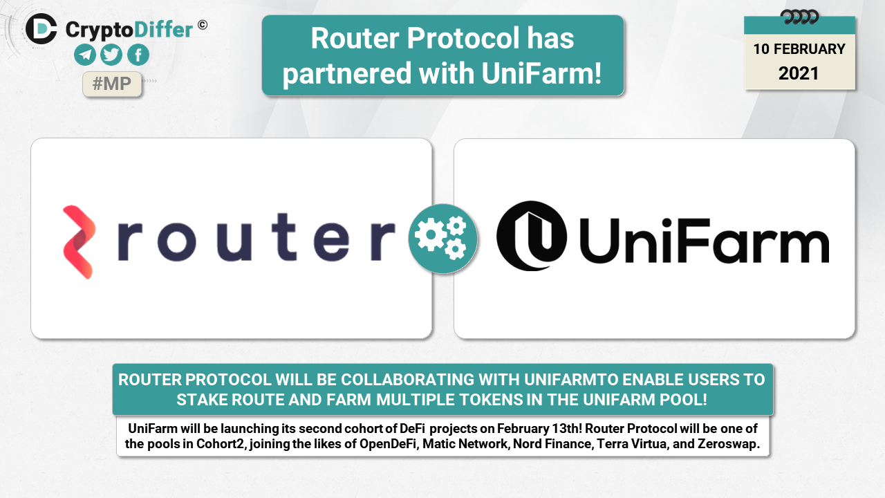 Router Protocol will be collaborating with UniFarm, a new staking product developed by OpenDeFi, to enable users to stake ROUTE and farm multiple tokens in the UniFarm pool. UniFarm will be launching its second cohort of DeFi projects on February 13th!