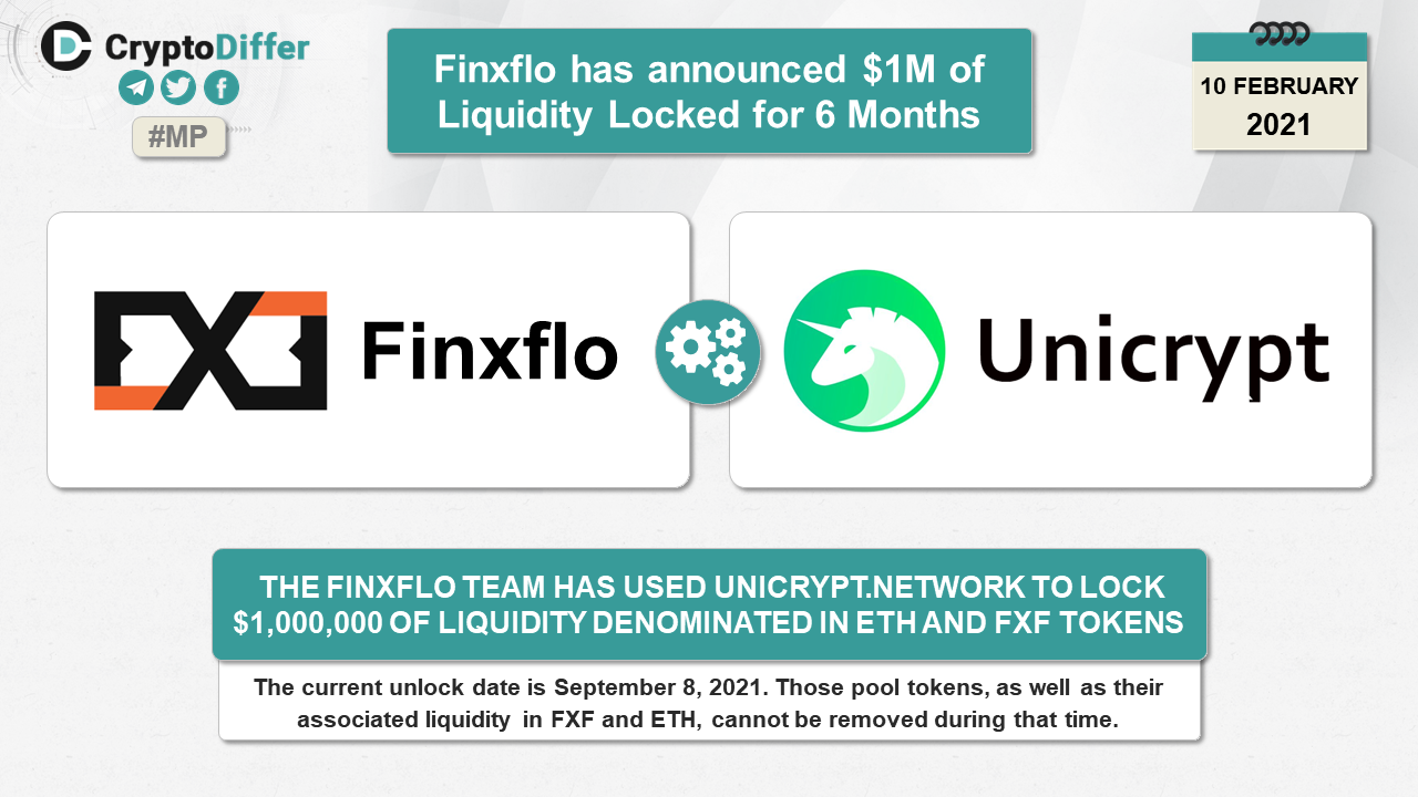 The Finxflo team has used Unicrypt.network to lock over $1,000,000 of liquidity denominated in ETH and FXF tokens. The current unlock date is September 8, 2021. Those pool tokens, as well as their associated liquidity in FXF and ETH, cannot be removed during that time.
