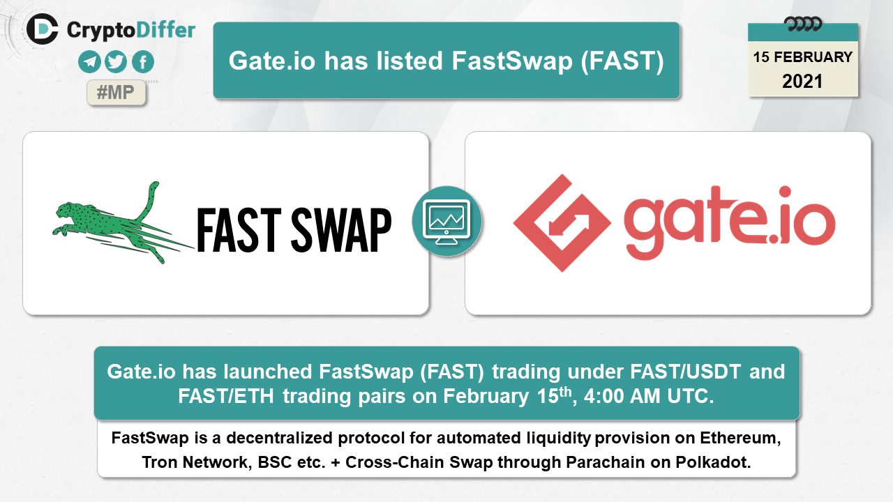 Gate has launched FastSwap (FAST) trading under FAST/USDT and FAST/ETH trading pairs on February 15th, 4:00 AM UTC.