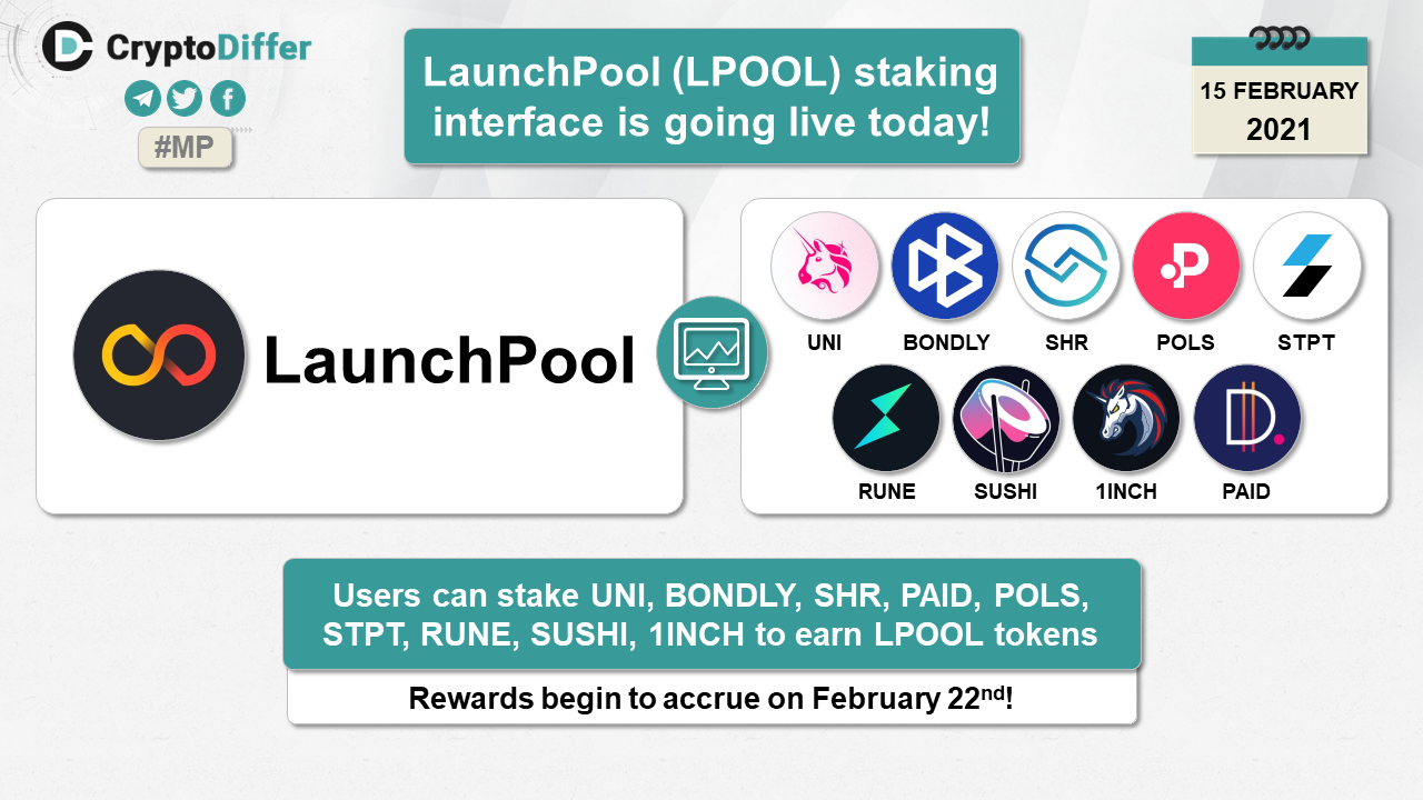 Users can stake UNI, BONDLY, SHR, PAID, POLS, STPT, RUNE, SUSHI, 1INCH to earn LPOOL tokens. Rewards begin to accrue on February 22nd!