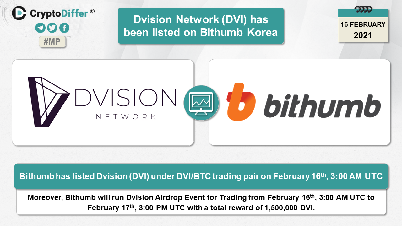 Bithumb has listed Dvision (DVI) under DVI/BTC trading pair on February 16th, 3:00 AM UTC. Moreover, Bithumb will run Dvision Airdrop Event for Trading from February 16th, 3:00 AM UTC to February 17th, 3:00 PM UTC with a total reward of 1,500,000 DVI.