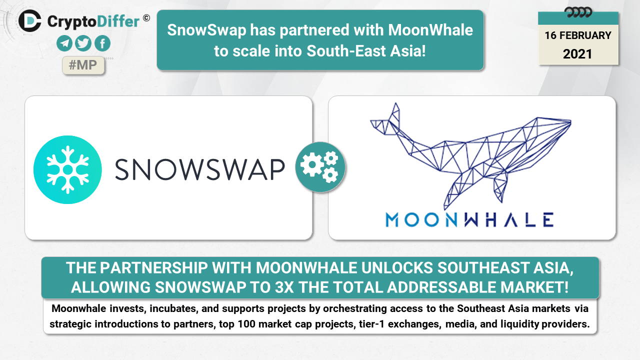 The partnership with Moonwhale unlocks SouthEast Asia, allowing SnowSwap to 3x the total addressable market. Moonwhale invests, incubates, and supports projects by orchestrating access to the Southeast Asia markets via strategic introductions to partners, top 100 market cap projects, tier-1 exchanges, media, and liquidity providers.