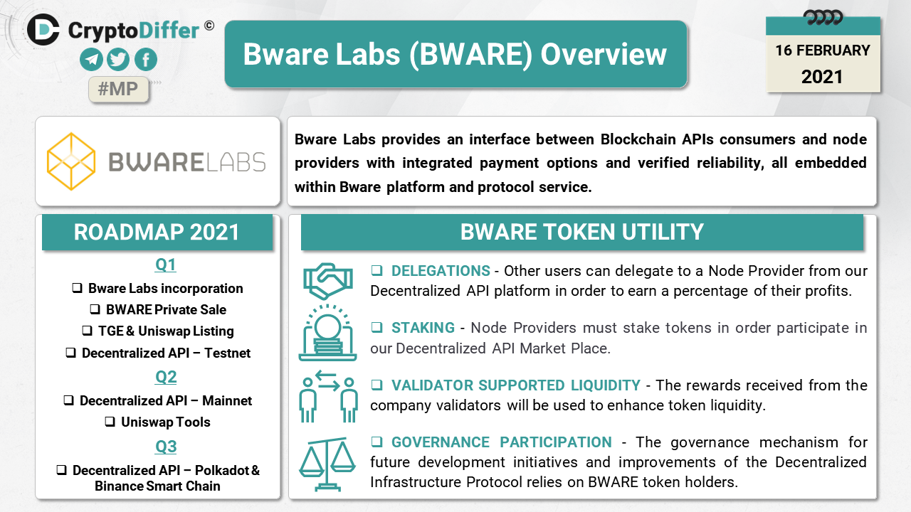 On the Phase 1 Bware Labs Decentralized Infrastructure will support Ethereum network & starting from Q3 2021 Bware Labs will expand to Polkadot, Binance Smart Chain, ETH2.0, Matic & more!