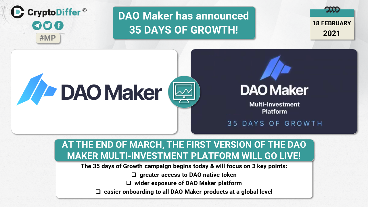 At the end of March, the first version of the DAO Maker Multi-Investment Platform will go live! The 35 days of Growth campaign begins today & will focus on 3 key points: