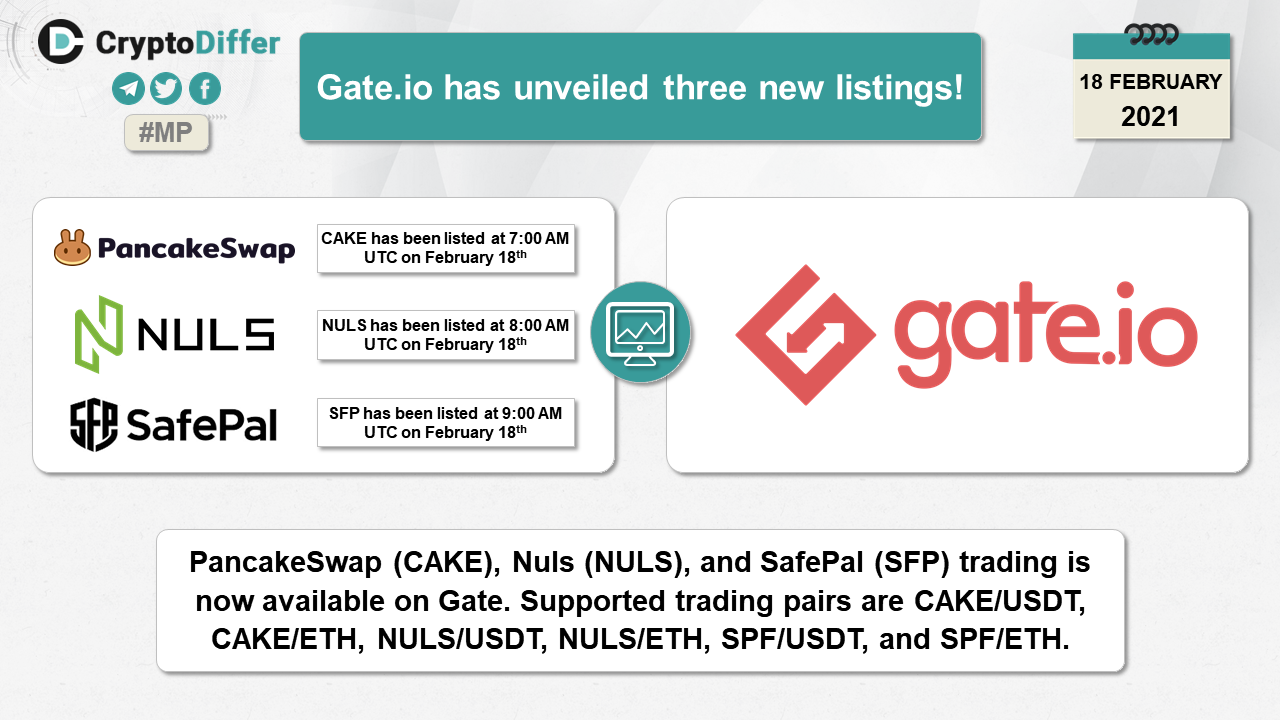 PancakeSwap (CAKE), Nuls (NULS), and SafePal (SFP) trading is now available on Gate. Supported trading pairs are CAKE/USDT, CAKE/ETH, NULS/USDT, NULS/ETH, SPF/USDT, and SPF/ETH.
