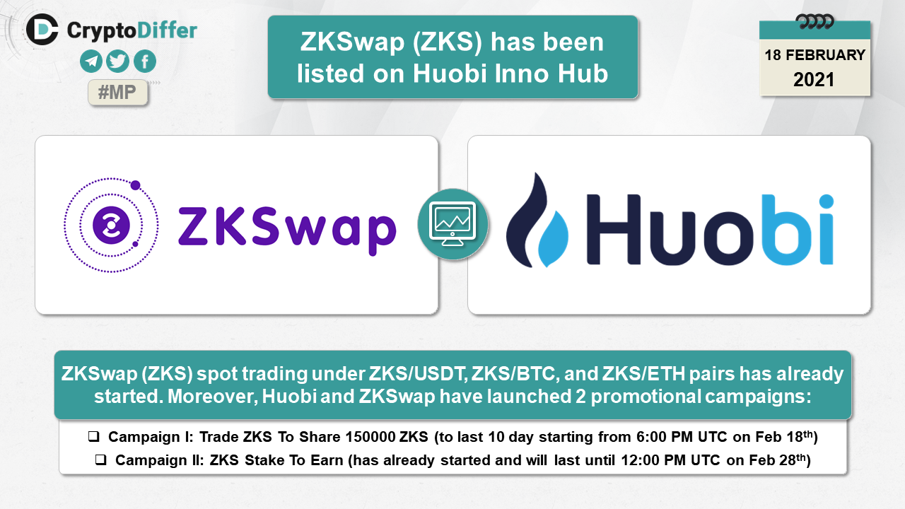 ZKSwap (ZKS) spot trading under ZKS/USDT, ZKS/BTC, and ZKS/ETH pairs has already started. Moreover, Huobi and ZKSwap have launched 2 promotional campaigns: