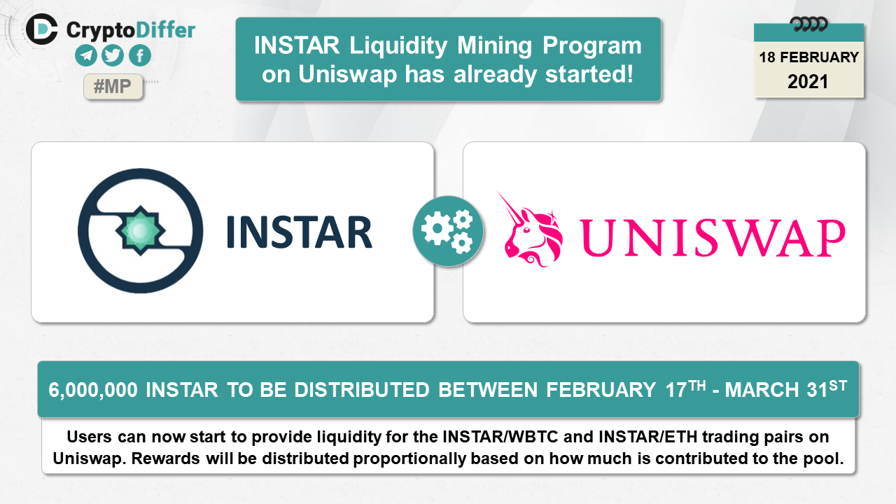 Users can now start to provide liquidity for the INSTAR/WBTC and INSTAR/ETH trading pairs on Uniswap. 6,000,000 INSTAR to be distributed between February 17th - March 31st.