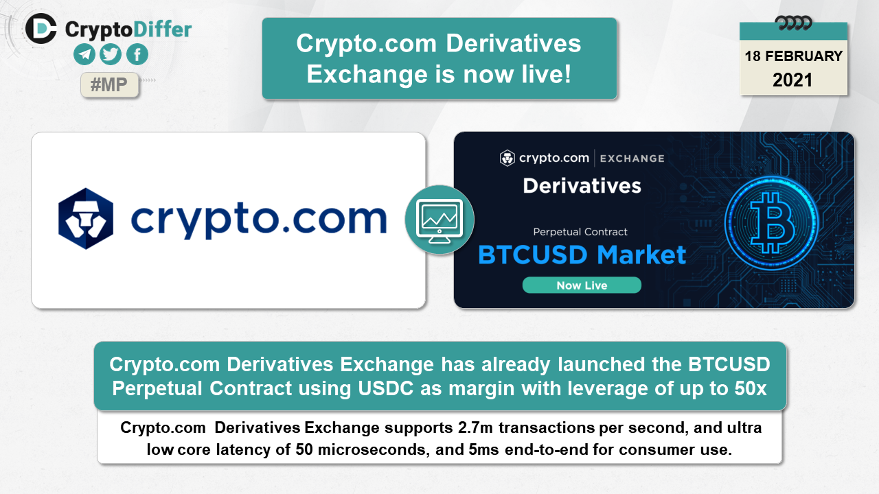 CryptoCom Derivatives Exchange has already launched the BTCUSD Perpetual Contract using USDC as margin with leverage of up to 50x. It supports 2.7m transactions per second, and ultra low core latency of 50 microseconds, and 5ms end-to-end for consumer use.