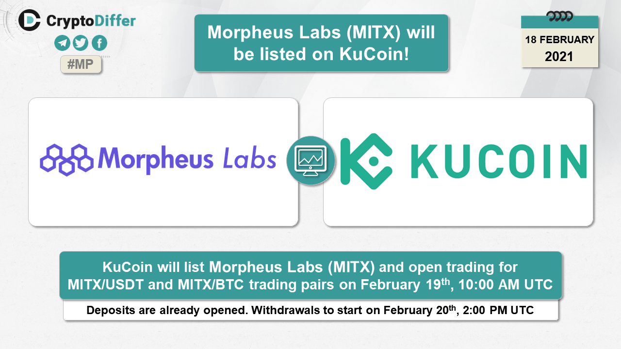 KuCoin to list Morpheus Labs (MITX) and open trading for MITX/USDT and MITX/BTC trading pairs on February 19th, 10:00 AM UTC.