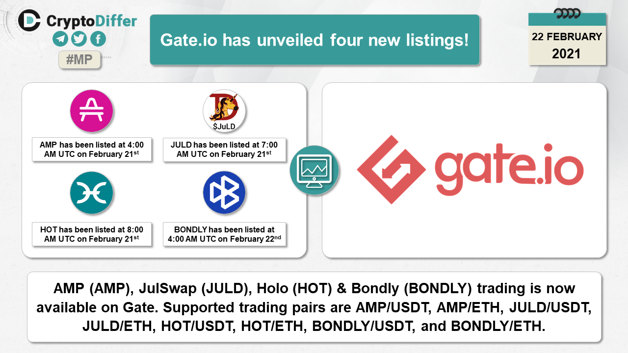 AMP (AMP), JulSwap (JULD), Holo (HOT) & Bondly (BONDLY) trading is now available on Gate. Supported trading pairs are AMP/USDT, AMP/ETH, JULD/USDT, JULD/ETH, HOT/USDT, HOT/ETH, BONDLY/USDT, and BONDLY/ETH.