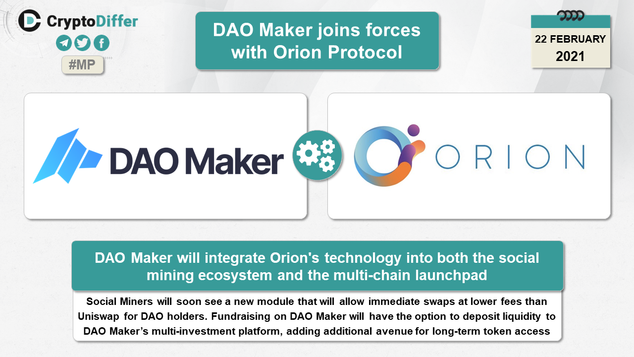 DAO Maker will integrate Orion's technology into both the social mining ecosystem and the multi-chain launchpad.