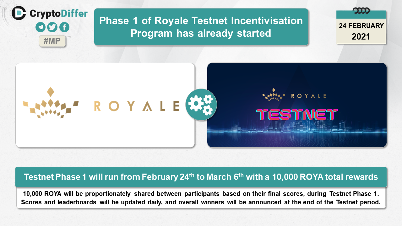 Testnet Phase 1 will run from February 24th to March 6th with a 10,000 ROYA total rewards.