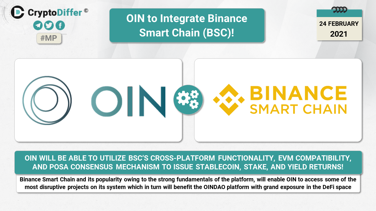OIN will be able to utilize BSCβs cross-platform functionality, EVM compatibility, and PoSA consensus mechanism to issue stablecoin, stake, and yield returns.