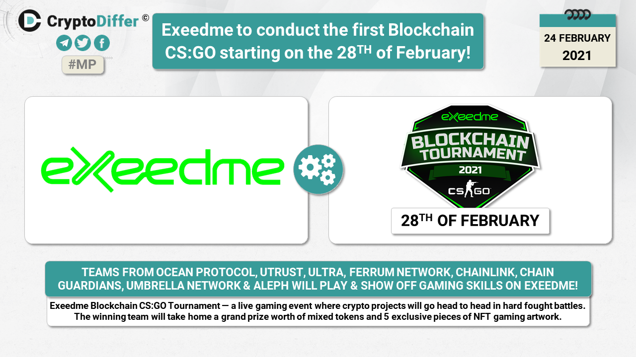 Exeedme Blockchain CS:GO Tournament β a live gaming event where crypto projects will go head to head in hard fought battles. The winning team will take home a grand prize worth of mixed tokens and 5 exclusive pieces of NFT gaming artwork.