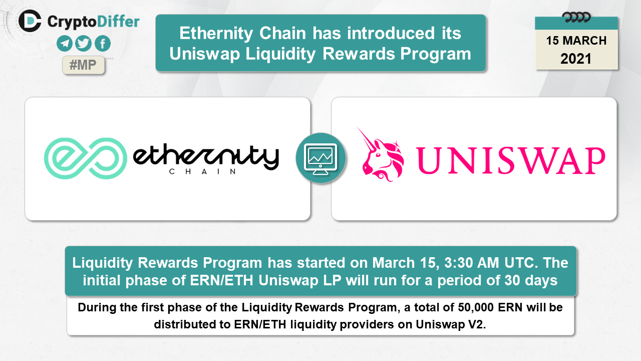 Liquidity Rewards Program has started on March 15, 3:30 AM UTC. The initial phase of ERN/ETH Uniswap LP will run for a period of 30 days. During the first phase of the Liquidity Rewards Program, a total of 50,000 ERN will be distributed to ERN/ETH liquidity providers on Uniswap V2.